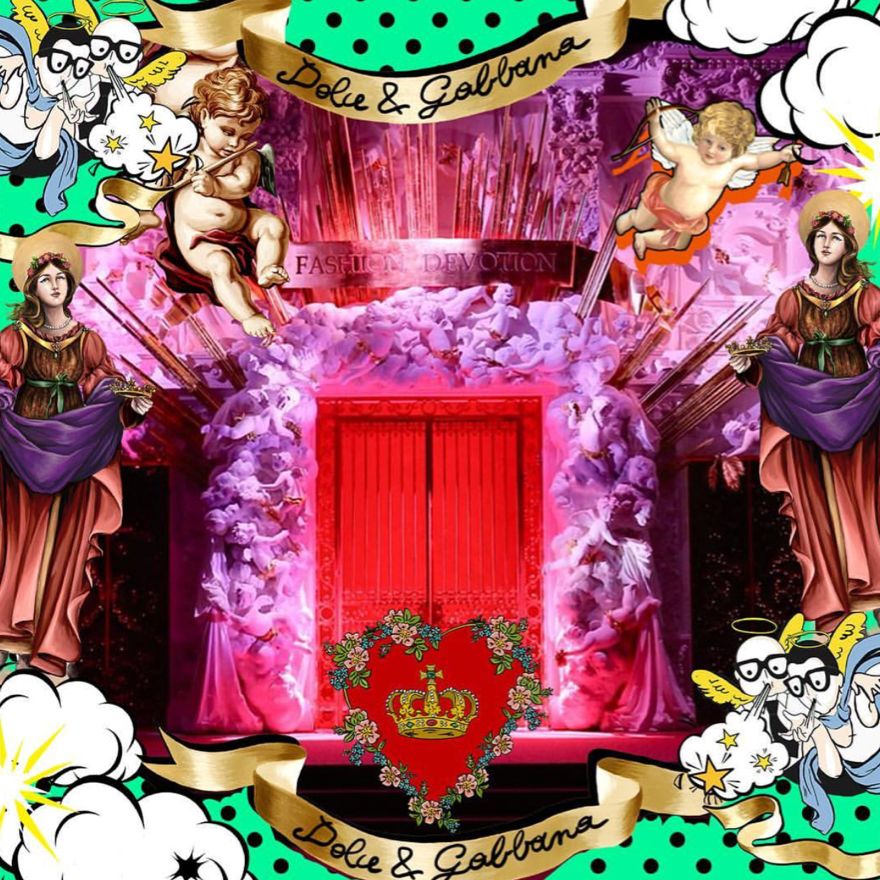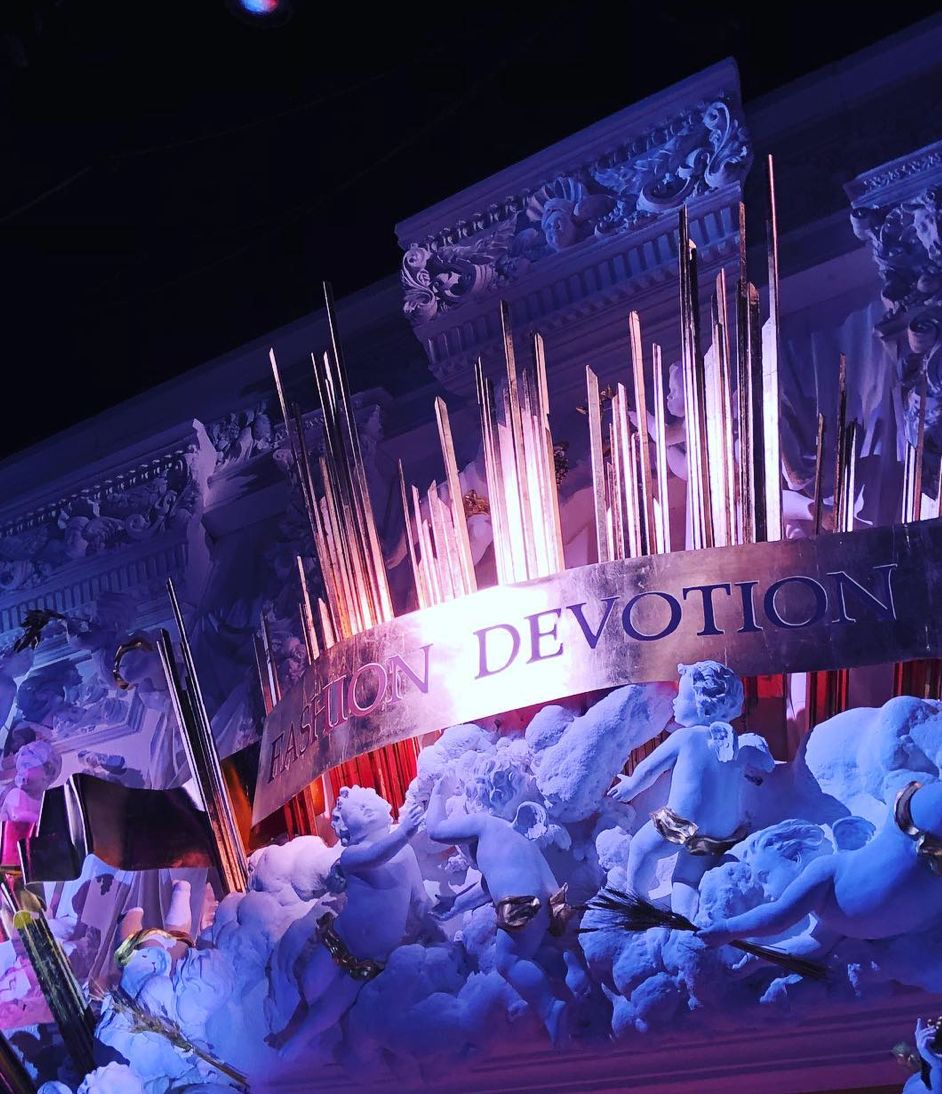 宫殿的正面是一个文艺复兴风格的长方形攻门,无数个小天使丘比特围绕着门廊相依而立,门廊上挂着的标语Fashion Devotion (愿为时尚奉献一切的热爱)是它的座右铭,给人一种就像吃了蜜糖一样的幸福感。