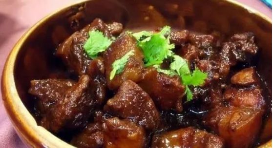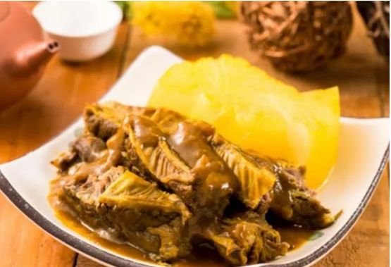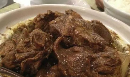 血鸭是澳式土生葡菜的代表菜式之一,别看这锅东西像咖喱似的,黑乎乎的,其实这些是鸭血做成的汁。鸭肉煮的软糯适中,充分吸收了鸭血的浓郁滋味,用来下饭非常适合。