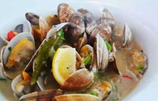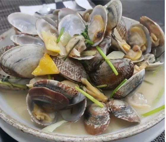 用柠檬汁、白酒及芫荽煮成的「西洋炒蚬」,吃起来清爽不腻口,加入的洋葱和淡淡的酒味,烘托出蚬肉原汁原味的鲜甜。此外,除了一尝新鲜肥美的蚬肉外,汤汁也非常赞,用外酥内软的葡式麵包沾上酱汁,又是另一种风味。