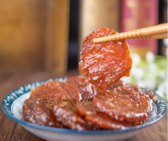 猪肉脯生产过程比较复杂而严格,选用的是新鲜猪肉后腿部分,剔去皮、膘、筋骨,取其整块纯瘦肉为基本原料,剖成薄片。然后,将配以白糖、味精、特级鱼露、鸡蛋等几十种佐料涂在肉片上,其中鱼露一味至关重要。之后,再将肉片平摊在一种特制的筛匾里烘烤。先后要经过片肉、拌料、摊筛、脱水、烘烤、压平、修剪、装箱等十几道工序,才成为那一片片色、香、味、形俱佳的肉脯,方可出厂上市。