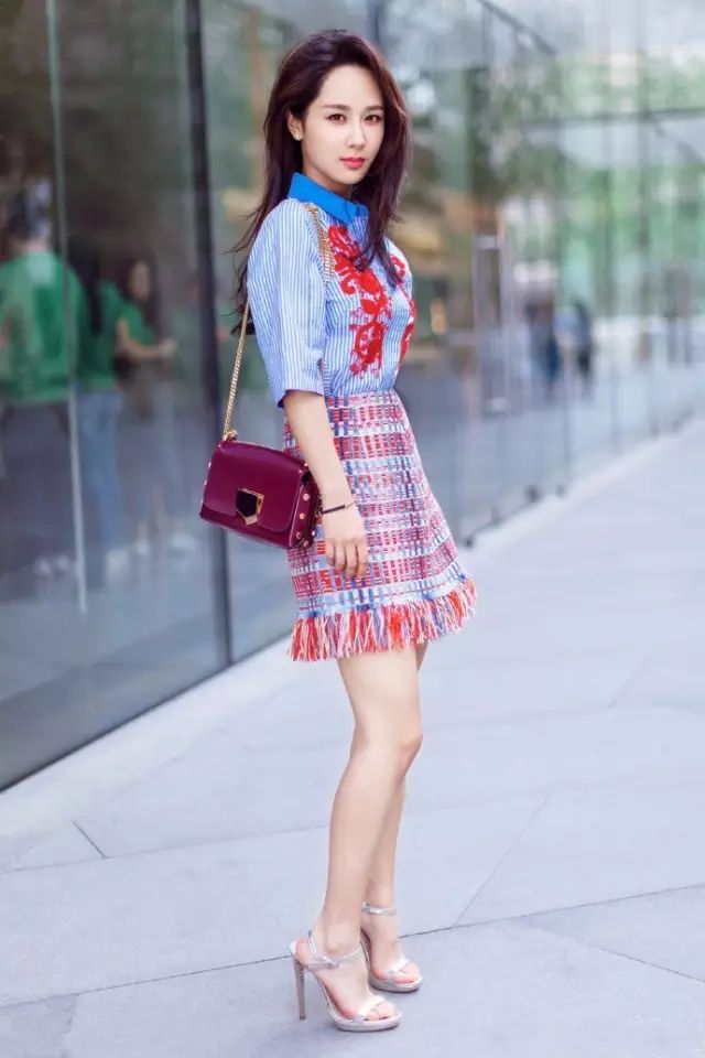 “马甲线女王”袁姗姗,对流苏单品也是宠爱有加。与江疏影一样选择黑色流苏半裙,但她搭配黑色上衣与黑白条纹外套,简单的黑白搭,时尚帅气。裙子上的流苏,飘逸感十足,弱化黑白配的酷感,增添些许柔美。