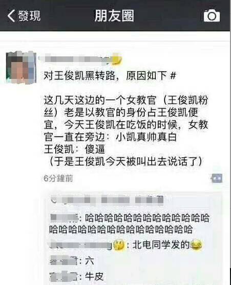 “造谣全凭一张嘴”“造谣全凭朋友圈”,就这样的朋友圈截图,造谣王俊凯被女教官粉丝找麻烦。