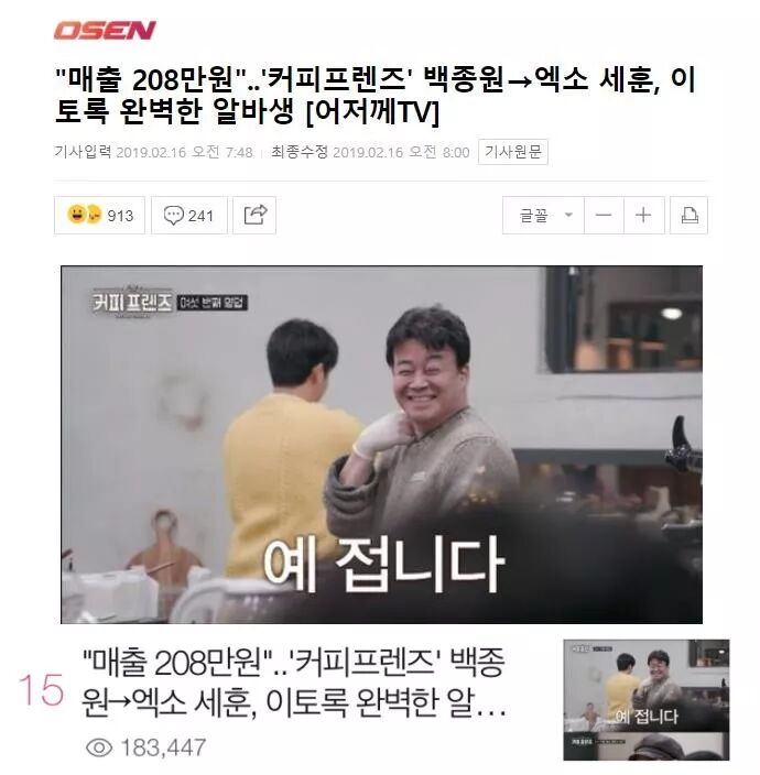 《咖啡之友》因为白钟元兼职生的活跃,营业额超过200万韩元(约合人民币12000元)