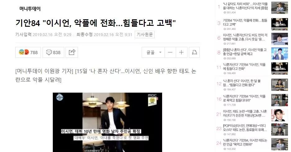 (本月6日,李时言出演了MBC综艺《Radio Star》。因为观众认为他在节目中对同期嘉宾Rain和新人演员的态度不好,受到观众指责,SNS和新闻下的留言恶评也很多。本期播出的《我独自生活》,李时言因电影行程未参与录制。)
