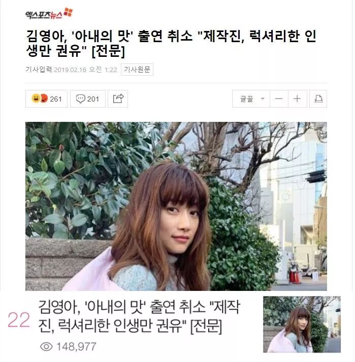 (《妻子的味道》是一档韩国明星夫妻在餐桌上的美食中寻找小小幸福的节目。此前,媒体曾传出电视剧《男生女生向前走》出身的演员金英雅将出演《妻子的味道》的消息。对此,15日,金英雅在SNS透露因为节目组劝她在《妻子的味道》走“奢侈生活”路线,她不满意,同时本人生活也较忙碌,决定不出演该节目)