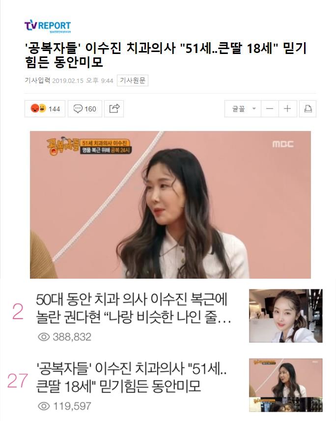 (《空腹者们》是一档以“嘉宾空腹24小时”为概念进行的节目。15日播出的节目中,牙医李秀珍今年51岁,同时有一个18岁的女儿,因为她年轻的外貌和姣好的身材,网友十分关注,播出当时李秀珍就登上了实时热搜)