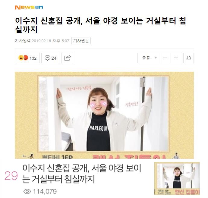 (李秀智是一名喜剧演员,2008正式出道,有着“女PSY”的外号。2018年12月她和3岁年下圈外男友结婚。最近她开通了YouTube账号,并在账号中公开了自己的婚房。)