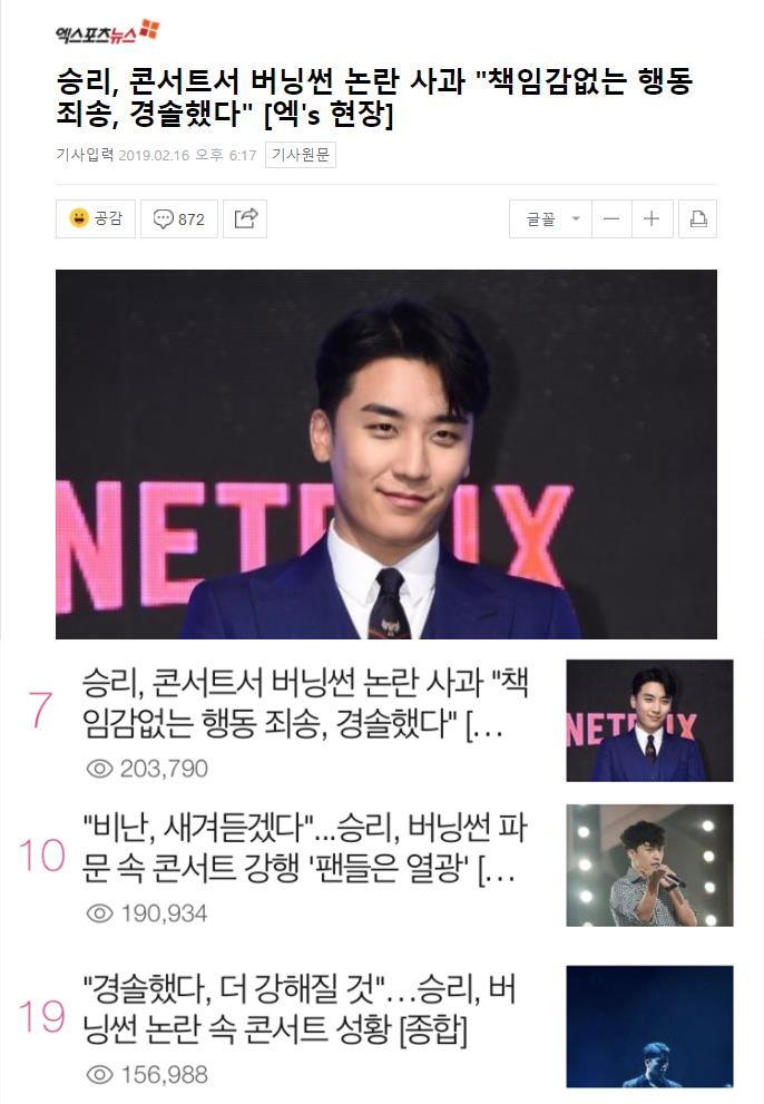 (胜利此前因Burning Sun夜店,陷入舆论风波。16日他在首尔奥林匹克手球竞技场举办的演唱会上就此事件再次做了道歉。)