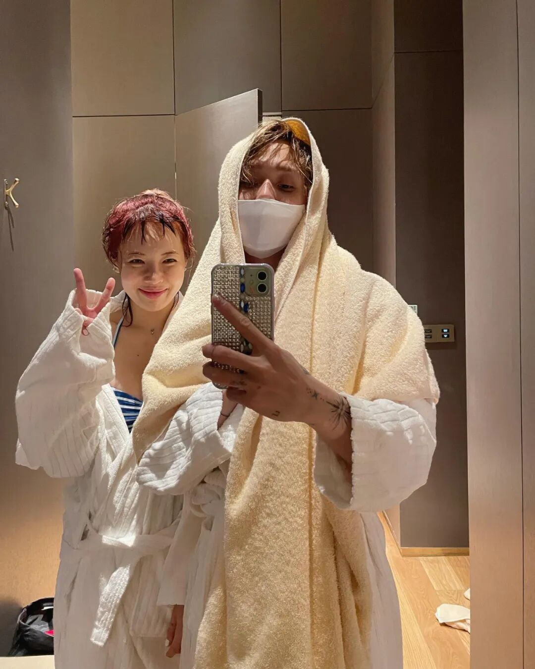 两人都披着浴袍,Dawn戴着口罩,泫雅顶着素颜、头发是刚出泳池的湿发。
