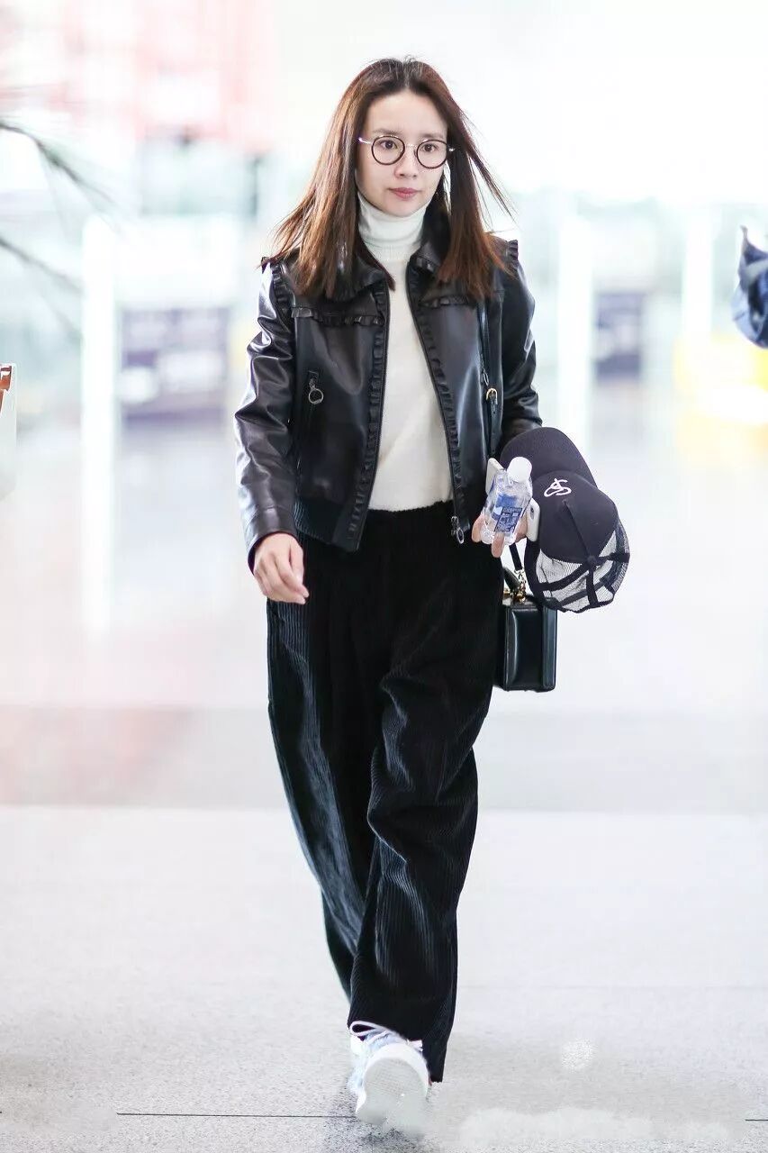 黑色长款裤子,让董洁的长腿十分迷人,同时搭配皮质短上衣,可爱的设计感觉,增加了董洁的活泼感。