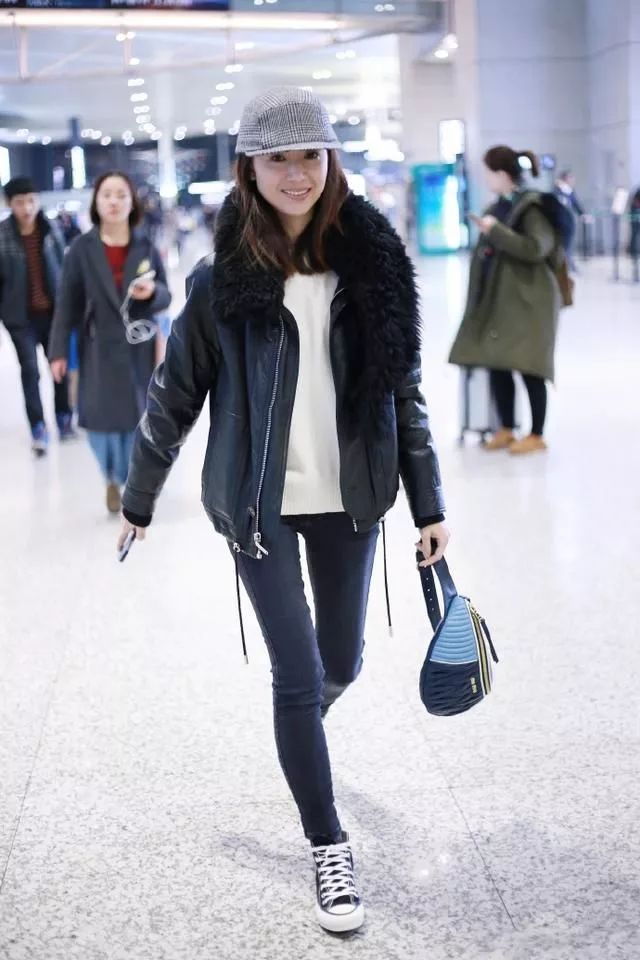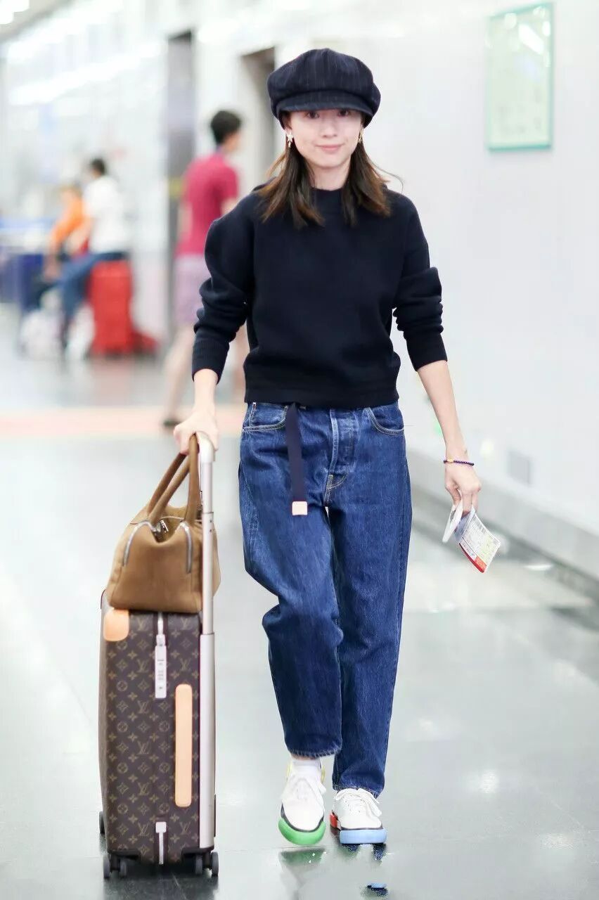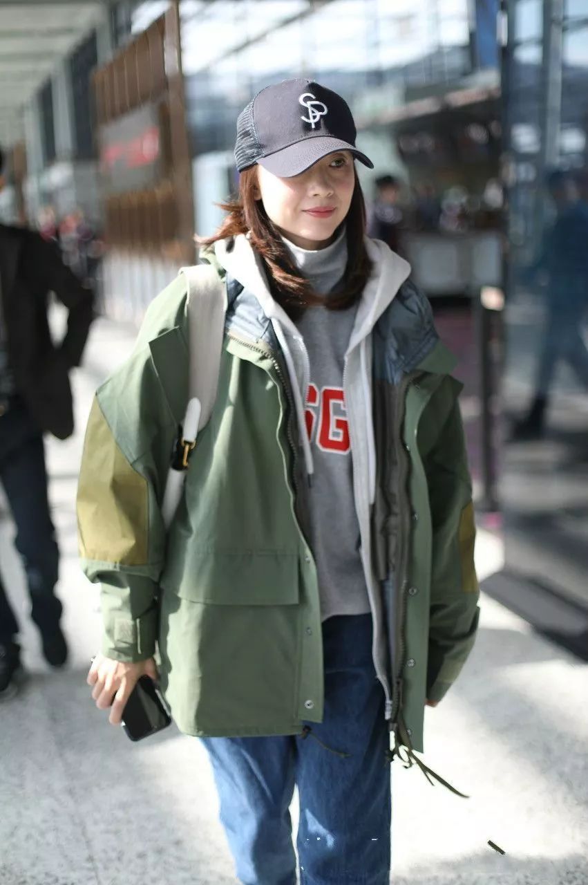 机场里的董洁,不拘小节,军绿色大衣,穿出时尚感,搭配经典牛仔,给人接地气的感觉。