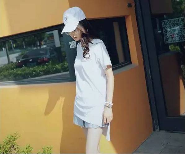 ▽2016夏季新款韩版时尚百搭圆领白色纯棉两侧开叉不对称T恤裙女装