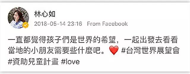 去年九月,她出席儿童助养活动,承诺每个月捐助600元台币帮助一位名为“萱萱”的儿童,可见,她对世界的孩子们是充满同情心和爱心的。