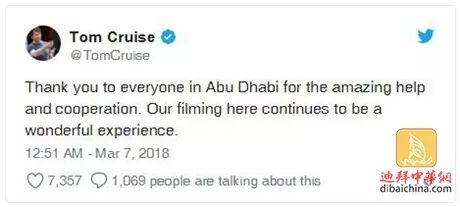 直到3月7日,汤姆克鲁斯亲自在推特上发布消息,证实了自己来阿布扎比是在拍电影的事实。