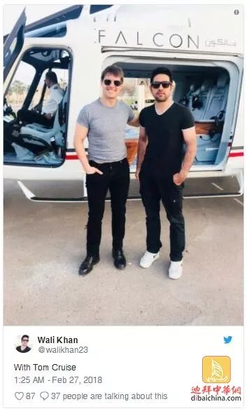 “他只是来玩的,不是在拍戏”,发布该照片的Wali Khan解释说,并表示“汤姆克鲁斯是一个非常好的人,总是满脸笑容,而且非常正义可靠。乘坐直升飞机起飞和着陆的时候他都来和我们握手道谢。我见过不少明星,他是我非常欣赏的一个。”