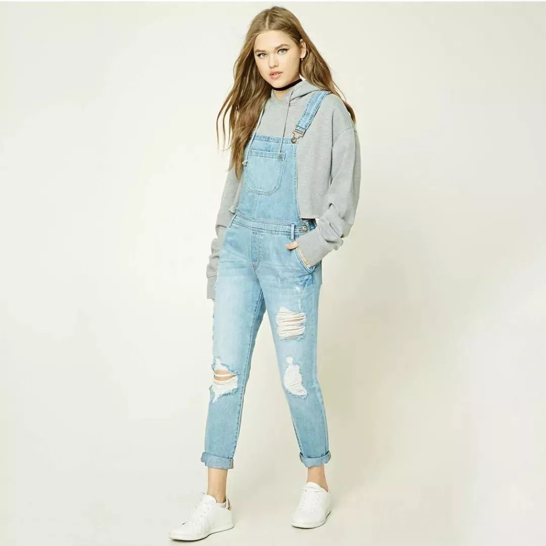 除了毛衣之外,背带裤和卫衣的搭配更是让街头感1+1>2的组合,简单的白色卫衣搭配牛仔背带裤,简单时髦,加个丸子头更可爱了。