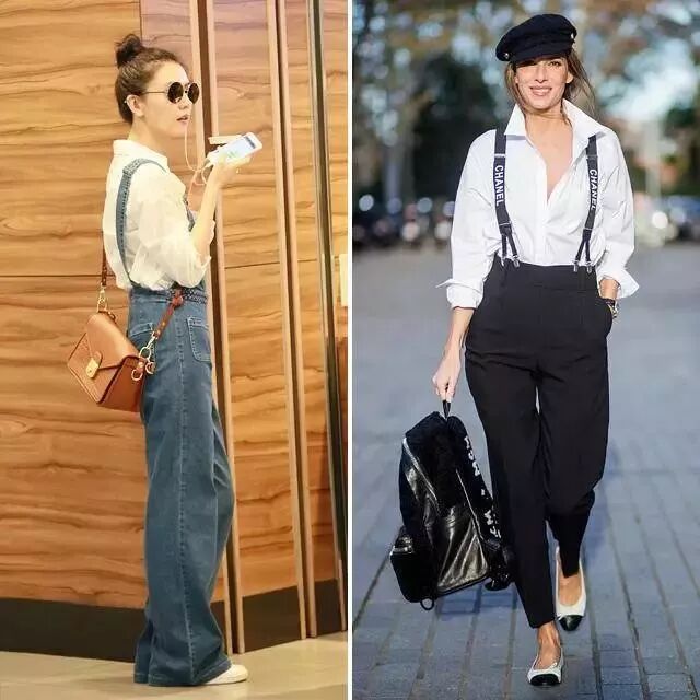 白衬衫搭配牛仔背带裤,自带清新气质,少女感十足;搭配黑色背带裤又是别样的时髦,加一个贝雷帽,一种摩登时髦感。