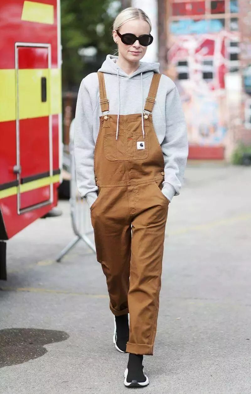 休闲风的连帽卫衣搭配驼色背带裤和运动鞋,舒适保暖,加一件西装外套就能变通勤装了。