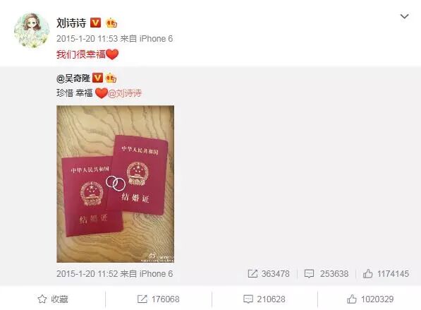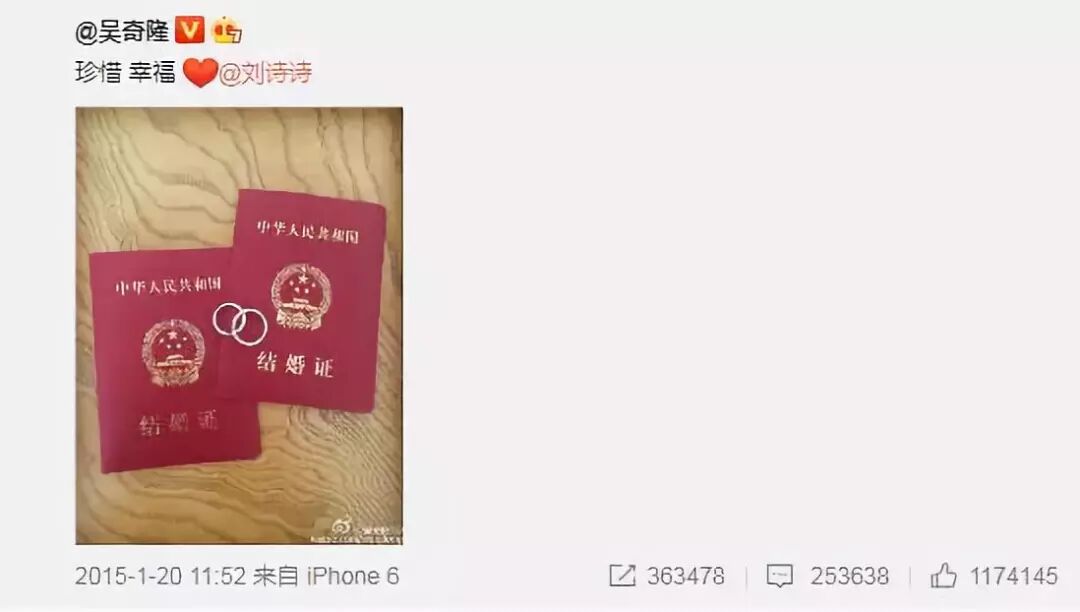 2015年1月20日,吴奇隆在微博晒出结婚证,公开与刘诗诗的喜讯