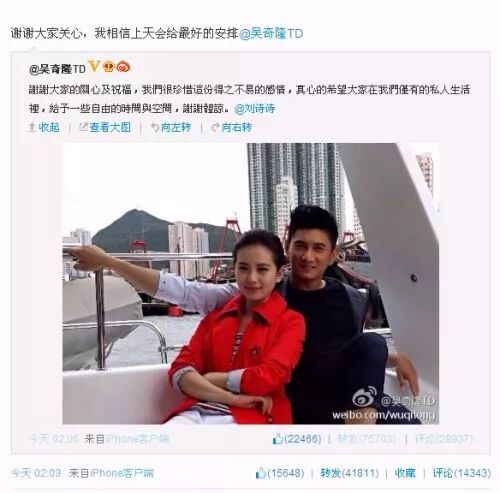 2013年11月13日凌晨,吴奇隆在微博上承认与刘诗诗的恋情,并称:“我们很珍惜这份得之不易的感情,并请求外界给予自由的时间与空间。”