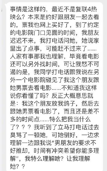 有po主表示自己的朋友鸽了自己和男朋友去看电影了,这种行为是否值得原谅?大家评评理。