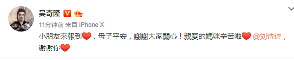 刚刚,吴奇隆微博宣布当爸,发文表示:“小朋友来报到,母子平安”