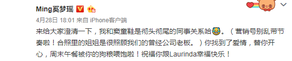 8日,奚梦瑶发文,否认自己是窦骁前女友,表示:“我和窦童鞋是彻头彻尾的同事关系。”更称对方找到了自己的幸福,自己很为他开心,“周末午餐被你的狗粮喂饱啦!祝福你跟Laurinda幸福快乐!”此前窦骁何超莲恋情曝光后,有人发文称奚梦瑶是窦骁前女友。