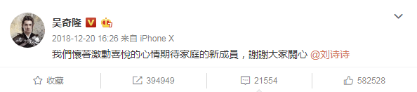 2018年12月20日,有媒体爆料称刘诗诗怀孕,吴奇隆即将当爸。当天吴奇隆发微博大方宣布自家将迎来小成员。