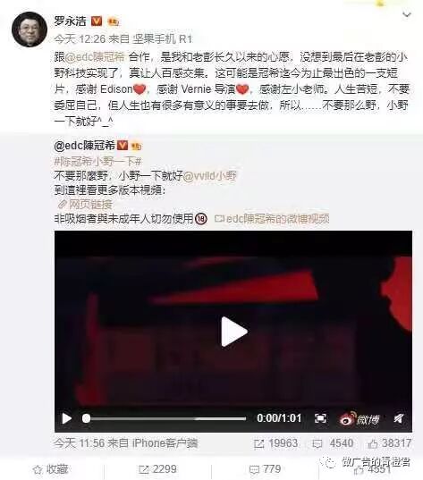 陈冠希在微博发布了一支小野电子烟的视频广告,vvild小野官方随后宣布,陈冠希将会正式出任vvild小野品牌特邀创意官,参与产品和品牌设计,并提供创意与灵感。