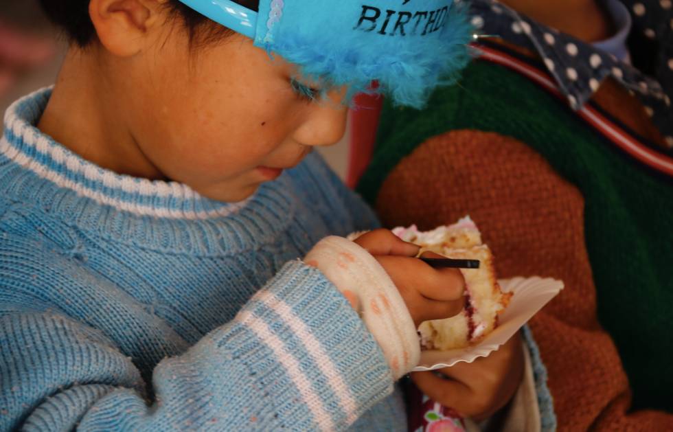 听到他们稚嫩的声音努力的学唱do re mi fa sol la si…看到他们不争不抢的分吃一小块生日蛋糕,即使很想吃,也要让着更小一点的妹妹…看到他们家里那年迈奶奶的婆娑双眼和我怎么握都感觉不能握暖的长满老茧的双手…还有那下课了,从四面八方伸过来想拉着你的小手…看着那扬满尘土的去往学校的小路…看着那一下雨就泥泞不堪无法通过的操场…还有那些每月仅拿着2000多元微薄收入依然铺在农村教育一线的教师们…每一次去,都感觉自己做的太少太少,想跟你们说,不管多么难,我们也会帮助你们把书读下去,一定要好好学习,去实现你们答应过老师的梦想!