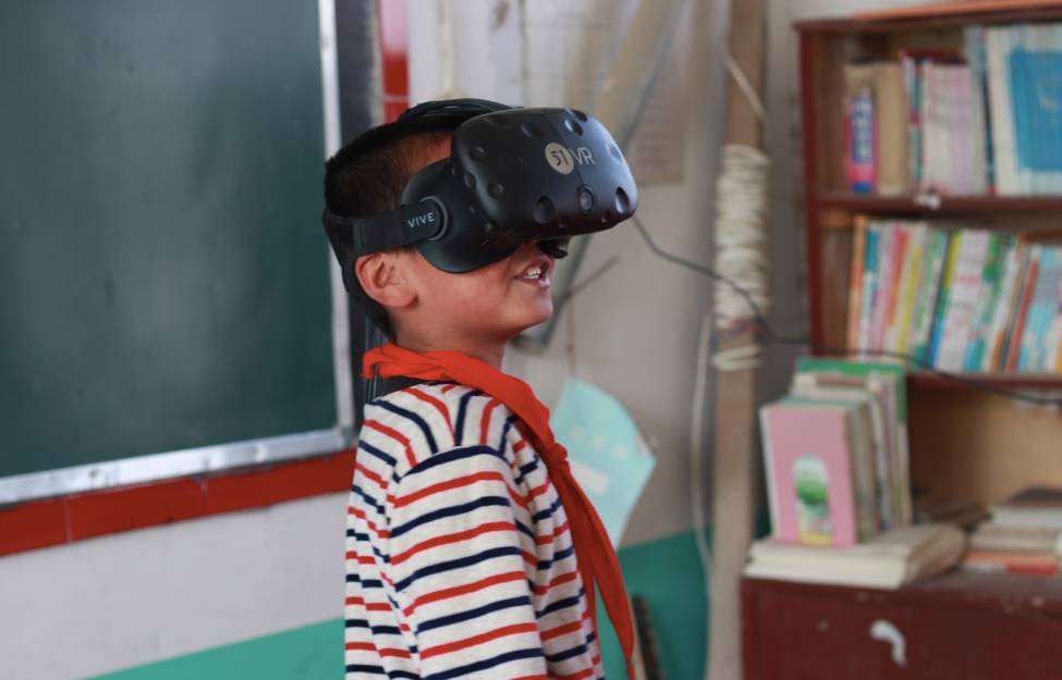 戴上VR眼镜的那刻,通过VR虚拟世界,孩子们第一次看到了大海、鲸鱼、海盗船等场景,惊奇不已。