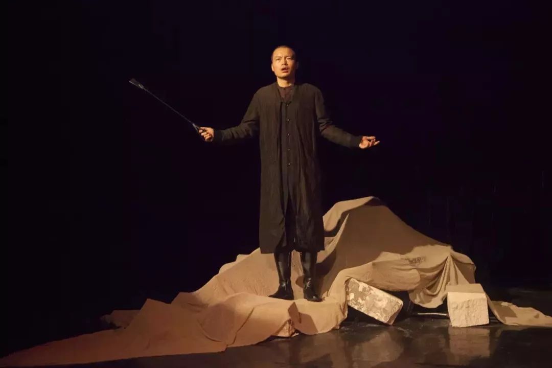 王音洁:王老师解释的已经非常清楚了,用一个诗的题材诗剧的文体方式来处理这样一个像幽灵一样的人物,而且这个人物可是又连接非常多的重大的历史事件,这一段时间对其实20世纪包括今天的整个亚洲具体到中国产生一个实质性的影响,虽然这个人物好像是像幽灵一样漂浮的。可能这就是我当时深深地被文本吸引的原因,当然刚才王老师也提到一个让我自己听起来也是胆战心惊的一个词,“浪漫主义”。同时后来我们又在浙江美术馆做了《韩非与李斯》的读演,但是还是选了这个剧,我们来尝试在剧场里面做出来。以我们当时的一个状况来完成它。因为我们不可能用专业剧团的演员或什么,我当时就想到了我的朋友们,用每一个朋友的那种生命政治、生命感的东西契合地来完成,把这个事情能够成塑形,当时是这样考虑的。但是我们从朗诵剧变成了一个来表演的事,这是怎么发生的我忘了。我们为什么做了这个改变?一开始根本没有考虑做演的,因为你在上海当时也是读的是,不是这个东西太难读了,读起来也不是那么容易,而且当时只有一个星期的时间了,最后就是说背。没想到罗兵也好,华侨也好,巴根也好,王炜也好,就背了。