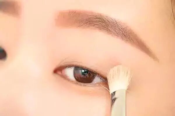 在眼皮的褶皱内处以及稍稍超出的区域内晕染上浅粉色眼影