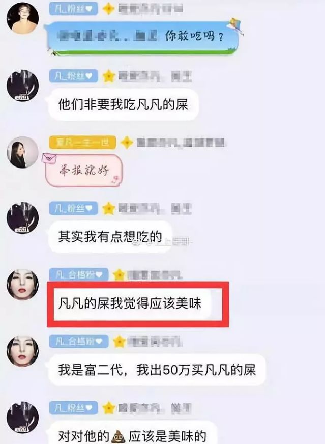 还有的粉丝在群里高喊:“XX的屎我觉得应该美味”,“我是富二代,我出50万买凡凡的屎”。