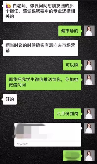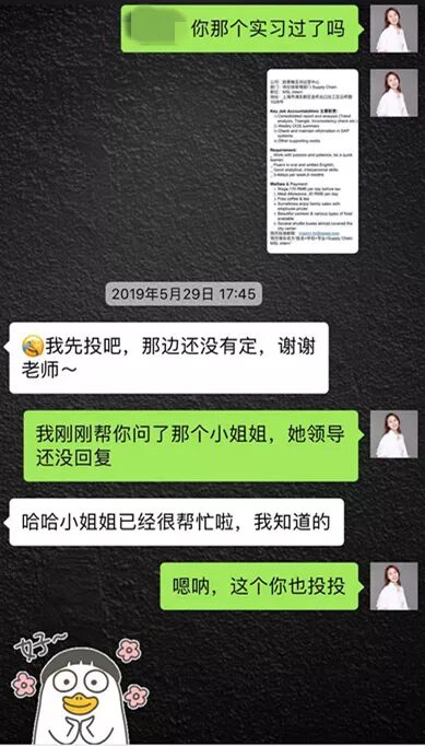 在学生找实习期间,Cassie老师也会给到学生各种内推实习的资源和机会。现在已经有很多学生在实习结束需要招继任的时候直接将招聘信息发给Cassie老师,请她帮忙找继任。