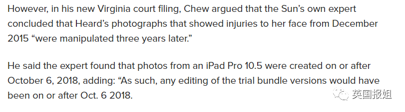 而德普方找到的专家表示,这些照片的数据有重大纰漏,和她的说法完全不吻合。