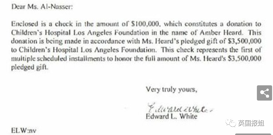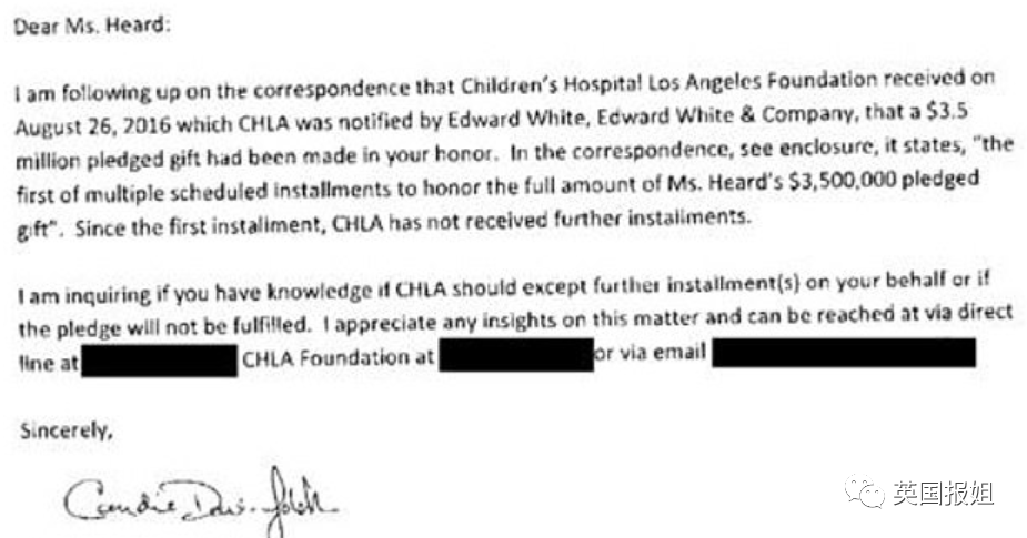 她承诺捐款的儿童医院院长专门写信问过艾梅柏:“到目前为止仅收到了最初的10万美元捐款,如果承诺不会兑现,是否需要免除剩余款项。”