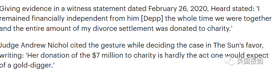 伦敦高等法院也采用了这一证据,认为艾梅柏并非是为了钱财诬告德普,并表示:“她向慈善机构捐款700万美元,这不是一个‘捞金女’的行为。”