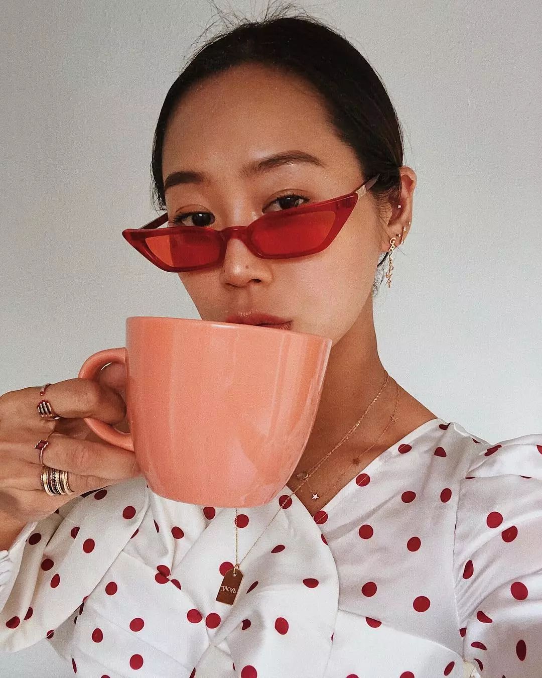看INS博主亲自示范,就算在家里喝咖啡也不忘带上墨镜,当然是因为好看,有型!