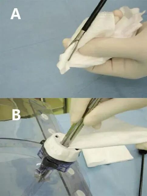 它由八个步骤组成:准备、除去水分、部分重叠、滚成一个圆锥形状、抓住圆锥、插入套管针、将材料释放于腹腔内和腹内的定位。