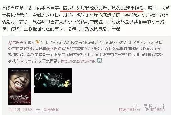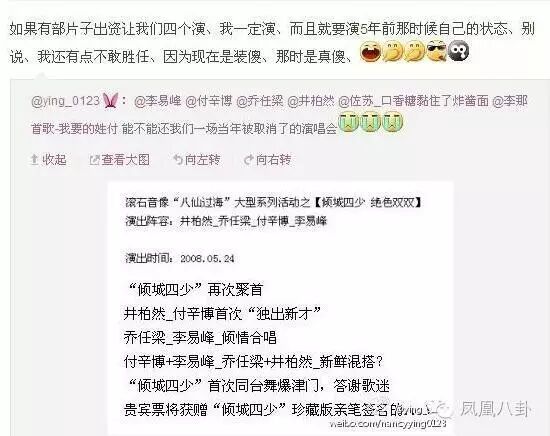 每隔一段时间,乔任梁的微博上就是po出关于“四少”的内容,甚至还说“如果有部片子出资让我们四个演,我一定演,而且要演5年前那时候自己的状态”: