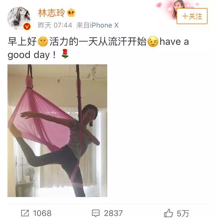 近日志玲姐姐晒出一张空中瑜伽美照