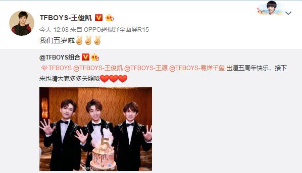 今天是TFBOYS组合出道五周年纪念日,TFBOYS组合官博上传一张三人合照,配文:“出道五周年快乐,接下来也请大家多多关照哦!”随后王俊凯、王源、易烊千玺同时转发微博,齐喊:“我们五岁啦!”
