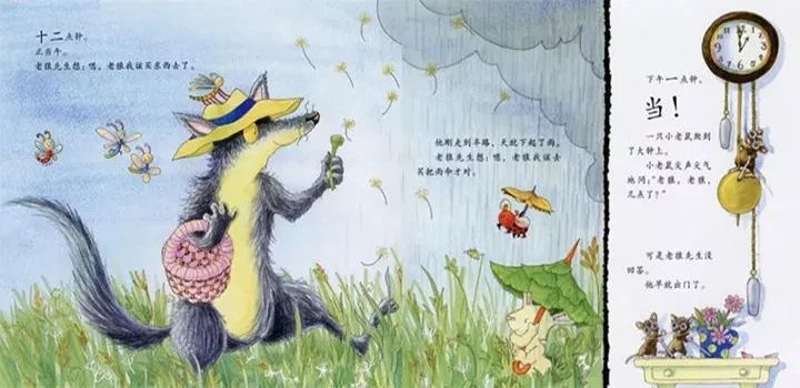 当!一只老鼠爬到了大钟上。小老鼠尖声尖气地问:“老狼,老狼,几点了?”