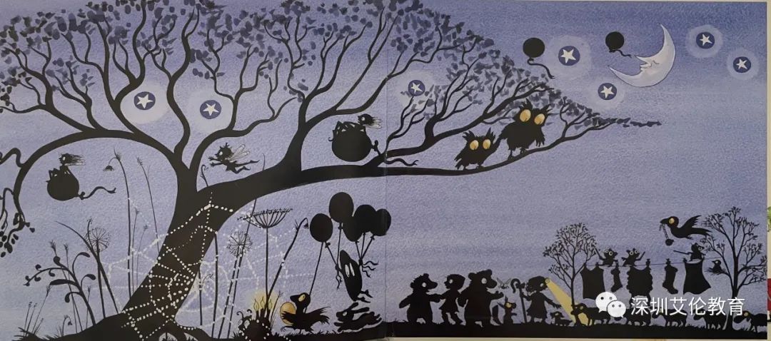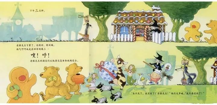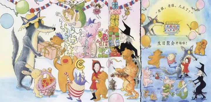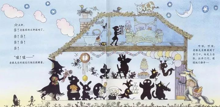 唱啊,跳啊,老狼先生的朋友们一直玩到很晚很晚,才开开心心地回家去。