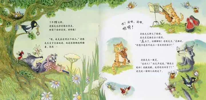 “嗯,我先生在这里打个盹,”老狼先生自言自语地说,他米迷迷糊糊地刚睡着,忽然.......嘿!滴嘟,滴嘟,哟嗬!老狼先生睁大眼睛。原来是花猫在拉小提琴。