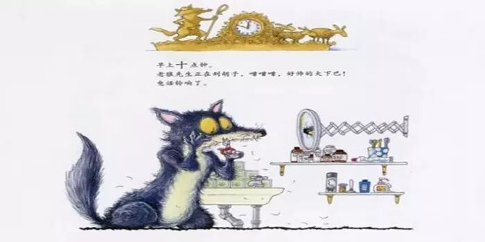 老狼先生一激灵。“我的天!”他尖声说道,“都这么晚啦!抱歉抱歉,我得赶快回家了!”说完就一溜烟儿的跑走了。