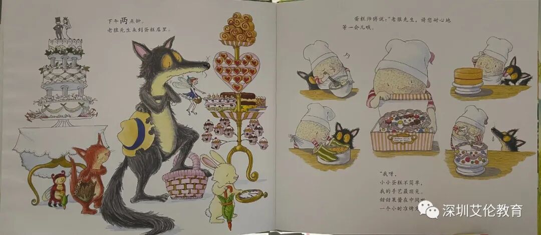 蛋糕师傅说:“老狼先生,请您耐心的等一会儿哦。”
