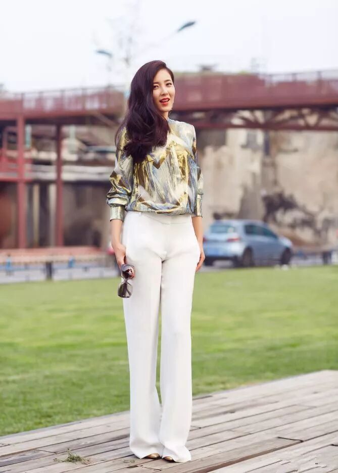 在很多单一的款式当中,很难见到这种金黄色的“锡纸亮片”,在日光的打照下特别吸引人瞩目。下面这条白色的西装裤给整个搭配添加亮点,将整个金黄色的突兀感降低了。建议喜欢气质穿搭的女性可以尝试一下这样的搭配,两者相结合压低了整个衣服的光亮感,显得更加高级优雅。身材高挑的大龄女性可以挑选这样的套装。