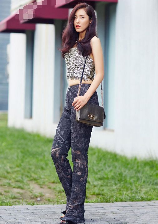 43岁的曾黎还能保持着这么完美的身材,真的是挺难得的,一件露脐金片背心显得十分性感,下半身搭配了一件蕾丝绣花的镂空长裤,整个腿部线条展现的淋漓尽致,腿又细又直。大波浪的发型尽显妩媚姿态,这样十分性感的装扮又有一种复古的潮流感。身材高挑的妹子们可以大胆的尝试一下这种风格,时尚本来就是一个轮回圈,复古也是一种潮流。
